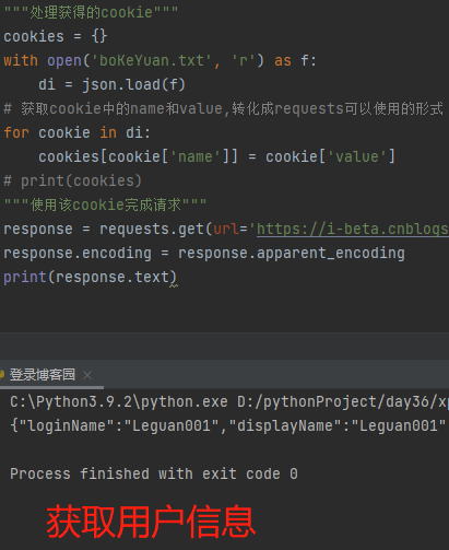 import requests from selenium import webdriver import time import json """ 使用selenium打开登录界面的网址,然后让用户完成手工登录,再获取cookie """ url = 'https://account.cnblogs.com/signin?returnUrl=https:%2F%2Fwww.cnblogs.com%2F' driver = webdriver.Chrome() driver.get(url=url) time.sleep(30) # 预留时间让用户输入用户名和密码 driver.refresh() # 获取登录成功之后服务端发回的cookie数据 cookiesB = driver.get_cookies # 保存获得的cookie with open('boKeYuan.txt', 'w') as f: json.dump(c, f) """ 处理获得的cookie """ cookies = {} with open('boKeYuan.txt', 'r') as f: di = json.load(f) # 获取cookie中的name和value,转化成requests可以使用的形式 for cookie in di: cookies[cookie['name']] = cookie['value'] print(cookies) """ 使用该cookie完成请求 """ response = requests.get(url='https://i-beta.cnblogs.com/api/user', cookies=cookies) response.encoding = response.apparent_encoding print(response.text)