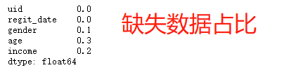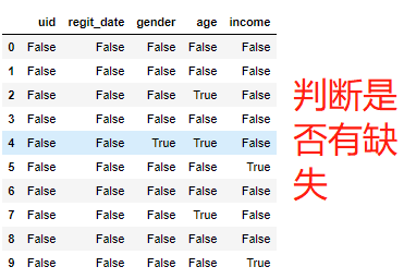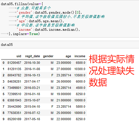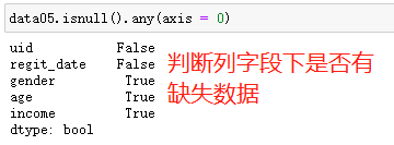 # 缺失值的识别与处理主要怕围绕以下三个方法进行 1.df.isnull() 2.df.fillna() 3.df.dropna() # 处理流程 1.读取文件 data05 = pd.read_excel(r'data_test05.xlsx') 2.先查看开始几行数据 data05.head() 3.判断每项数据是否有缺失 data05.isnull() 判断列字段下是否有缺失数据 data05.isnull().any(axis = 0) 4.计算各列数据的缺失比例 data05.isnull().sum(axis = 0)/data05.shape[0] # 处理方法 5.常规处理方式 (1)删除缺失数据(如缺失数据比例足够小,可删) data05.dropna() (2)将所有缺失值填充为指定值(一般不推荐) data05.fillna(value=0) '''针对不同的缺失值需要采用合理的填充手段''' 6.特殊处理方式 data05.fillna(value={ # 众数,可能有多个 'gender':data05.gender.mode()[0], # 平均值,该字段取值范围较小,不易受极限值影响 'age':data05.age.mean(), # 中位数,该字段易受极限值影响 'income':data05.income.median(), },inplace=True)
