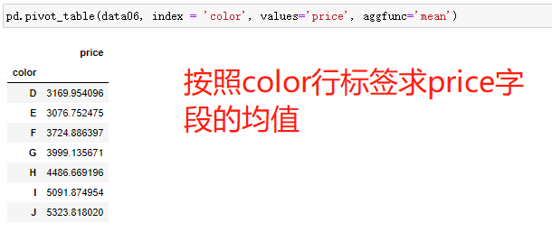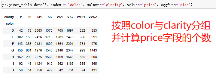 # 透视表 pd.pivot_table(data, values=None, index=None, columns=None, aggfunc='mean', fill_value=None, margins=False, dropna=True, margins_name='All') # 参数说明 1.data:指定需要构造透视表的数据集 2.values:指定需要显示成数值的字段 3.index:指定行标签字段 4.columns:指定列标签字段 5.aggfunc:指定数值的统计函数,默认为均值;也可以使用numpy模块中其他函数 6.fill_value:指定用于填充缺失数据的值 7.margins:bool类型,判断是否需要显示行或列的总和,默认为False 8.dropna:bool类型,判断是否需要删除整列均缺失的字段,默认为True 9.margins_name:指定行或列的总和名,默认为All '''案例''' data06 = pd.read_csv(r'diamonds.csv') data06.head() pd.pivot_table(data06, index = 'color', values='price', aggfunc='mean') pd.pivot_table(data06, index = 'color', columns='clarity', values='price', aggfunc='size')