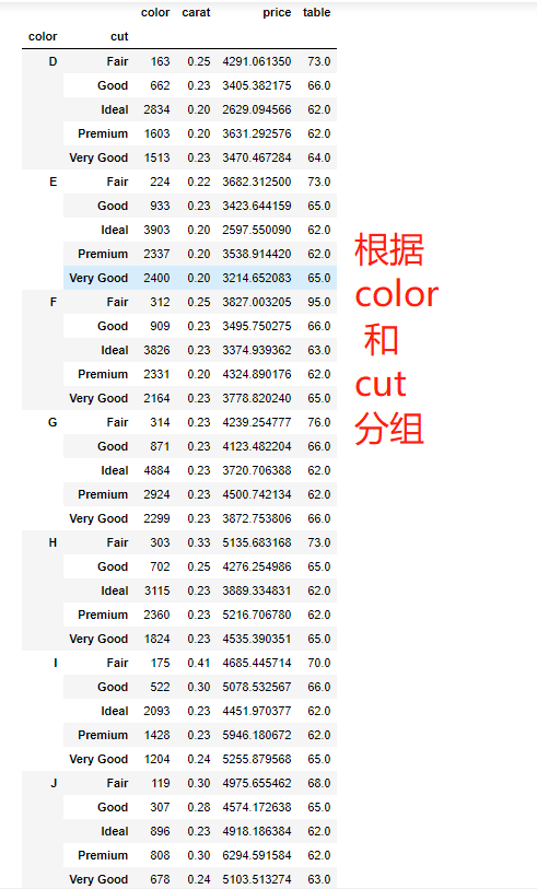 # 使用聚合函数需要引入numpy模块 import numpy as np # 通过group方法,指定分组依据 groupDf = data06.groupby(by=['color','cut']) # 对分组后的数据进行统计汇总 result = groupDf.aggregate({ 'color':np.size,'carat':np.min, 'price':np.mean,'table':np.max }) # 调整变量名的顺序 result = pd.DataFrame(result, columns=['color','carat','price','table']) # 数据集重命名 result.rename(columns={'color':'counts', 'carat':'min_weight', 'price':'avg_price', 'table':'max_table'}, inplace=True)