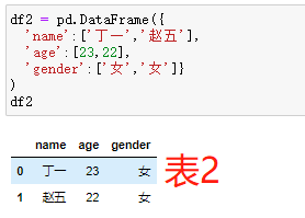 '''案例''' # 构造数据集df1和df2 df1 = pd.DataFrame({ 'name':['张三','李四','王二'], 'age':[21,25,22], 'gender':['男','女','男']} ) df2 = pd.DataFrame({ 'name':['丁一','赵五'], 'age':[23,22], 'gender':['女','女']} )
