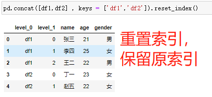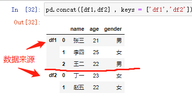 pd.concat(objs,axis=0,join='outer',join_axes=None, ignore_index=False,keys=None) # 参数说明 1.objs:需要合并的对象,可以是序列(series),数据框(dataframe),或者数据构成的列表 2.axis:数据合并的轴方向,默认为 0-行,1-列 3.join:合并的方式,默认为outer表示合并所有数据,inner为合并公共数据 4.join_axes:合并数据后保留的数据轴 5.ignore_index:bool类型,判断是否忽略原数据索引,默认为 False——不忽略,True——忽略原索引生成新索引 6.keys:为合并后的数据添加表示合并前对象的新索引,用于区分各个部分# 数据集的纵向合并 pd.concat([df1,df2] , keys = ['df1','df2']) # 加keys参数可以在合并之后看到数据来源 pd.concat([df1,df2] , keys = ['df1','df2']).reset_index() pd.concat([df1,df2] , keys = ['df1','df2']).reset_index().drop(labels ='level_1', axis = 1).rename(columns = {'level_0':'Class'}) # 如果df2数据集中的“姓名变量为Name” df2 = pd.DataFrame({ 'Name':['丁一','赵五'], 'age':[23,22], 'gender':['女','女']} ) # 数据集的纵向合并 pd.concat([df1,df2]) # concat行合并,数据源的变量名称完全相同(变量名顺序没有要求)
