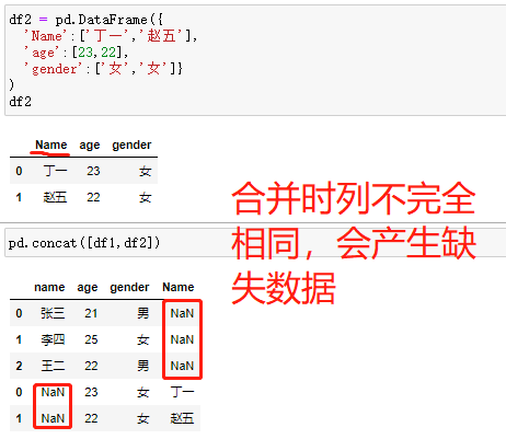 # 如果df2数据集中的“姓名变量为Name” df2 = pd.DataFrame({ 'Name':['丁一','赵五'], 'age':[23,22], 'gender':['女','女']} ) # 数据集的纵向合并 pd.concat([df1,df2]) # concat行合并,数据源的变量名称完全相同(变量名顺序没有要求)