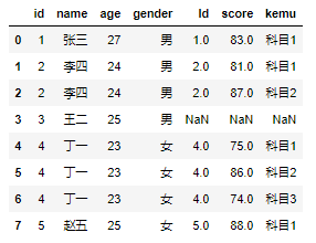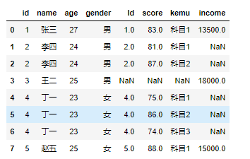 '''案例''' # 构造数据集 df3 = pd.DataFrame({ 'id':[1,2,3,4,5], 'name':['张三','李四','王二','丁一','赵五'], 'age':[27,24,25,23,25], 'gender':['男','男','男','女','女']}) df4 = pd.DataFrame({ 'Id':[1,2,2,4,4,4,5], 'score':[83,81,87,75,86,74,88], 'kemu':['科目1','科目1','科目2','科目1','科目2','科目3','科目1']}) df5 = pd.DataFrame({ 'id':[1,3,5], 'name':['张三','王二','赵五'], 'income':[13500,18000,15000]})