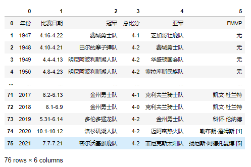 # 返回列表,其中是当前页面的所有表格数据 res = pd.read_html('https://baike.baidu.com/item/NBA%E6%80%BB%E5%86%A0%E5%86%9B/2173192?fr=aladdin') type(res) # 返回列表,获取需要的有效数据即可 champion = res[0]