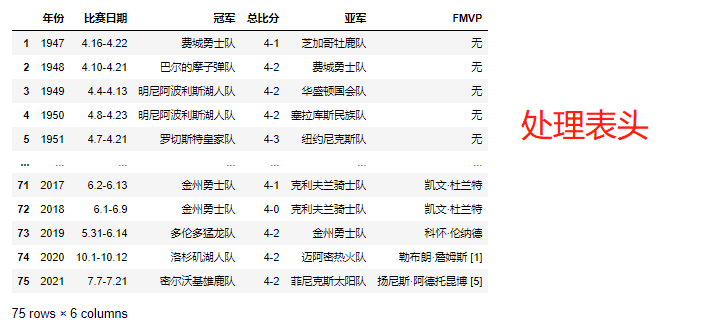 # 处理列字段名称:将第一行数据设置为表头,再删除第一行 champion.rename(columns=champion.iloc[0],inplace=True) champion.drop(0,inplace=True)