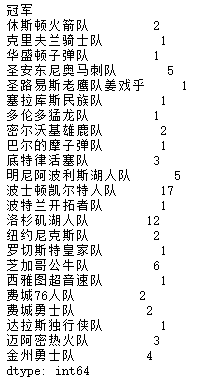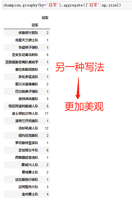 # 获取分组后各组大小 champion.groupby('冠军').size() champion.groupby(by='冠军').aggregate({'冠军':np.size})
