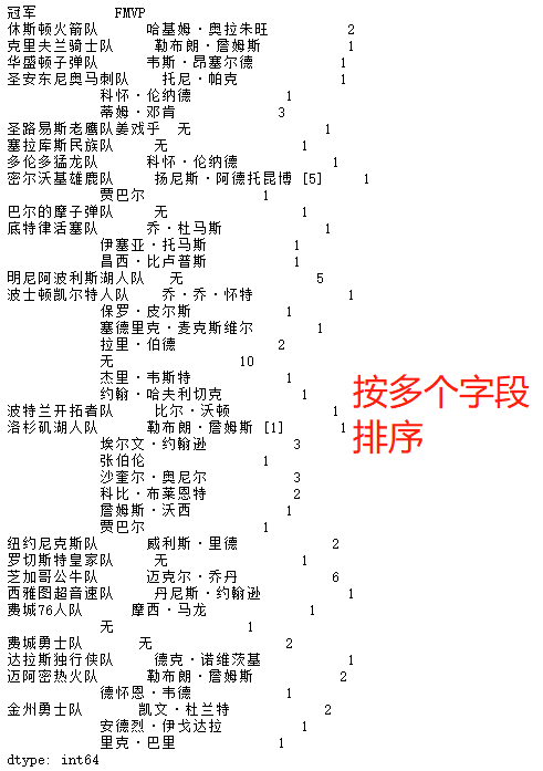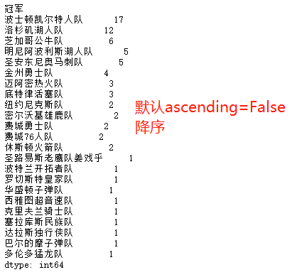 # 获取各组获得冠军的次数 ascending=False(降序)/True(升序) champion.groupby('冠军').size().sort_values(ascending=False)