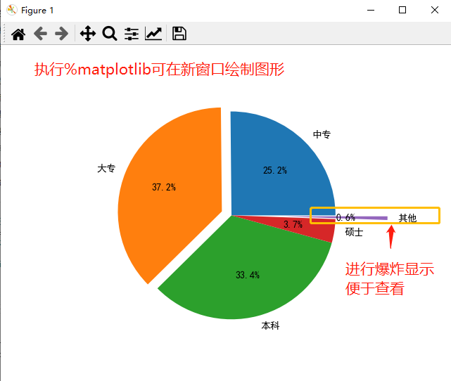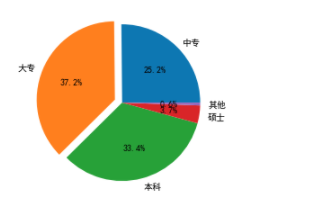 '''案例''' # 导入第三方模块 import matplotlib.pyplot as plt # 解决中文乱码情况 plt.rcParams['font.sans-serif'] = ['SimHei'] # 构造数据 edu = [0.2515,0.3724,0.3336,0.0368,0.0057] labels = ['中专','大专','本科','硕士','其他'] explode = [0,0.1,0,0,0]