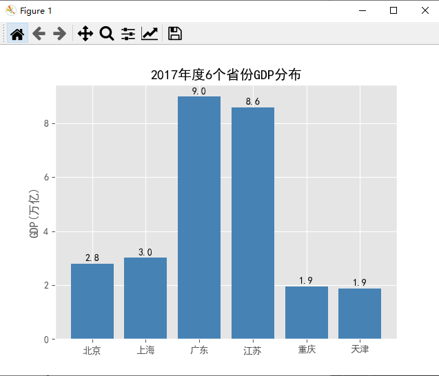 # 设置绘图风格(不妨使用R语言中的ggplot2风格) plt.style.use('ggplot') # 绘制条形图 plt.bar(x = range(GDP.shape[0]), # 指定条形图x轴的刻度值 height = GDP.GDP, # 指定条形图y轴的数值 tick_label = GDP.Province, # 指定条形图x轴的刻度标签 color = 'steelblue', # 指定条形图的填充色 ) # 添加y轴的标签 plt.label('GDP(万亿)') # 添加条形图的标题 plt.title('2017年度6个省份GDP分布') # 为每个条形图添加数值标签 for x,y in enumerate(GDP.GDP): plt.text(x,y+0.1,'%s' %round(y,1),ha='center') # 显示图形 plt.show()