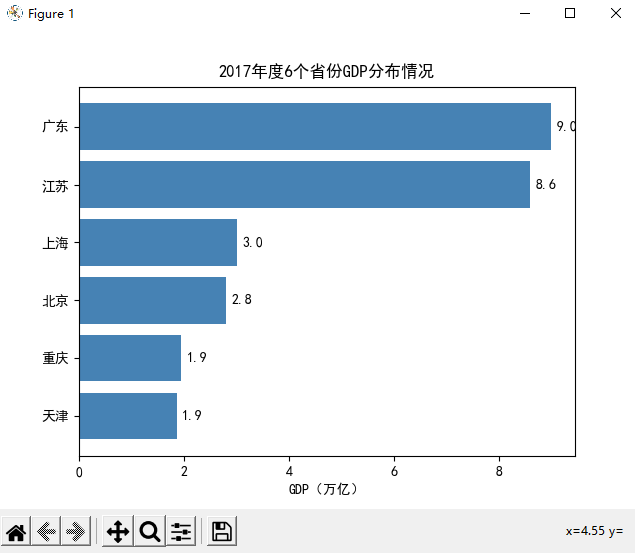import matplotlib.pyplot as plt import pandas as pd # 解决中文乱码 plt.rcParams['font.sans-serif'] = ['SimHei'] # 读入数据 GDP = pd.read_excel(r'Province GDP 2017.xlsx') # 对读入的数据做升序排序 GDP.sort_values(by = 'GDP', inplace = True) # 绘制水平条形图 bar之后的h表示horizon plt.barh( y = range(GDP.shape[0]), # y轴刻度 width = GDP.GDP, # x轴数值 tick_label = GDP.Province, # y轴刻度标签 color = 'steelblue' # 条形填充色 ) # x轴标签 plt.xlabel('GDP(万亿)') # 标题 plt.title('2017年度6个省份GDP分布情况') # 在每个条形末端添加数值 枚举 for y,x in enumerate(GDP.GDP): plt.text(x+0.1, y, '%s' %round(x,1), va='center') # 显示图形 plt.show()