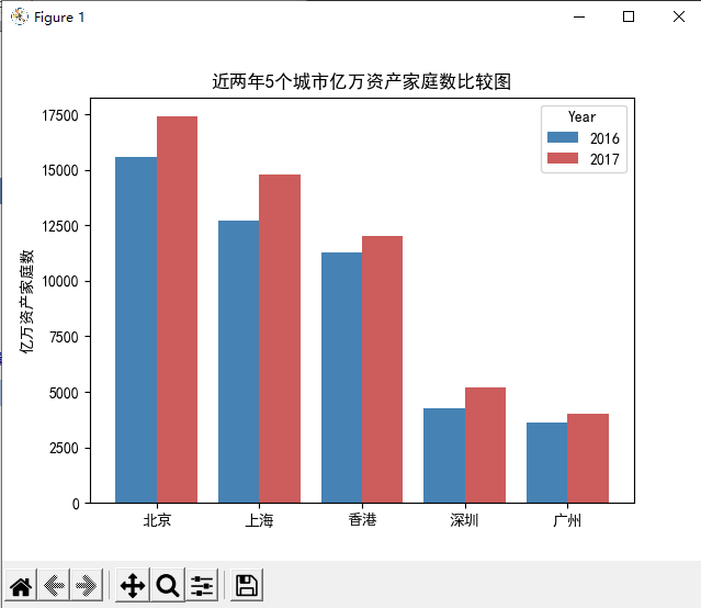 import matplotlib.pyplot as plt import pandas as pd # 解决中文乱码 plt.rcParams['font.sans-serif'] = ['SimHei'] # 读取数据 HuRun = pd.read_excel('HuRun.xlsx') # 制作透视表 HuRun_reshape = HuRun.pivot_table( index = 'City', columns = 'Year', values = 'Counts' ).reset_index() # 降序排列 HuRun_reshape.sort_values( by = 2016, ascending = False, inplace = True ) # 绘图,类型指定为条形 HuRun_reshape.plot( x = 'City', y = [2016,2017], # x轴一项对应多个值 kind = 'bar', color = ['steelblue', 'indianred'], rot = 0, # 标签旋转角度,默认0-水平 width = 0.8, title = '近两年5个城市亿万资产家庭数比较图' ) # y轴标签 plt.ylabel('亿万资产家庭数') # 这里x不需要标签,置空 plt.xlabel('') # 显示图形 plt.show()