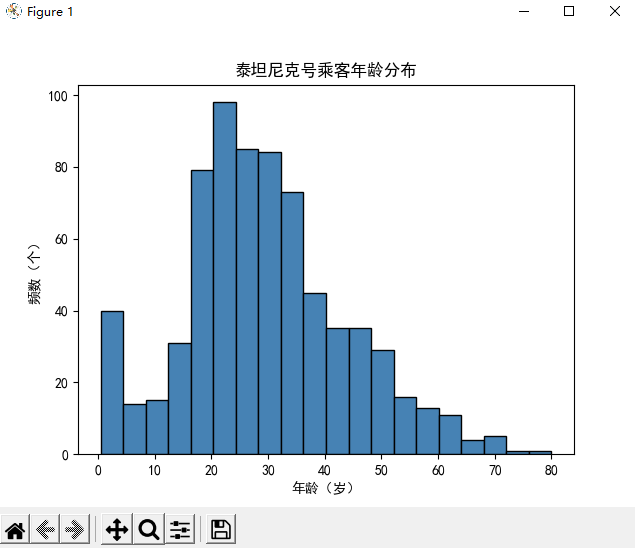 plt.hist( x, bins=10, normed=False, orientation='vertical', color=None, label=None ) # 参数说明 1.x:需要绘图的数据 2.bins:直方图条形个数 3.normed:是否将直方图的频数转换成频率 4.orientation:直方图方向,默认vertical——垂直 5.color:填充色 6.edgecolor:边框色 7.label:标签,通过legend()展示图例 '''案例''' import matplotlib.pyplot as plt import pandas as pd # 解决中文乱码 plt.rcParams['font.sans-serif'] = ['SimHei'] # 读取数据 Titanic = pd.read_csv('titanic_train.csv') # 校验年龄是否存在缺失值(直方图是连续的,不能使用缺失数据) any(Titanic.Age.isnull()) # 绘图 plt.hist( x = Titanic.Age # 绘图数据 bins = 20, # 条形个数 color = 'steelblue' # 填充色 edgecolor = 'black' # 边框色 ) # x,y轴标签 plt.xlabel('年龄') plt.ylabel('频数') # 标题 plt.tilte('泰坦尼克号乘客年龄分布') # 显示图形 plt.show()