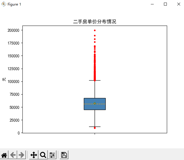 import matplotlib.pyplot as plt import pandas as pd # 解决中文乱码 plt.rcParams['font.sans-serif'] = ['SimHei'] # 读取数据 Sec_Buildings = pd.read_excel('sec_buildings.xlsx') plt.boxplot( x=Sec_Buildings.price_unit, # 绘图数据 patch_artist=True, # 用自定义颜色填充箱体,默认 False-白色 showmeans=True, # 显示均值 boxprops={ 'color': 'black', # 箱体边框色 'facecolor': 'steelblue' # 箱体填充色 }, flierprops={ 'marker': 'o', # 异常点的形状 'markerfacecolor': 'red', # 异常点填充色 'markersize': 3, # 异常点大小 'markeredgecolor': 'red', # 异常点边框色 }, meanprops={ 'marker': 'D', # 均值点的形状 'markerfacecolor': 'indianred', # 均值点填充色 'markersize': 4, # 均值点大小 }, medianprops={ 'linestyle': '--', # 中位数线类型 默认实线 'color': 'orange' # 中位数线颜色 }, labels=[''] # 删除x轴刻度标签,默认显示1 ) plt.ylabel('元') # 标题 plt.title('二手房单价分布情况') # 显示图形 plt.show()