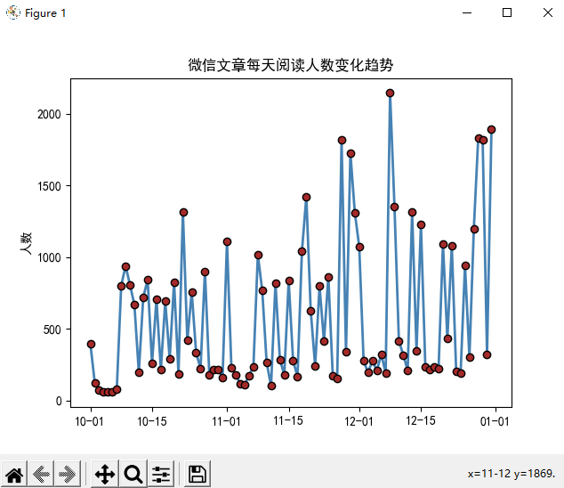 import matplotlib.pyplot as plt import matplotlib as mpl import pandas as pd # 解决中文乱码 plt.rcParams['font.sans-serif'] = ['SimHei'] # 读取数据 wechat = pd.read_excel(r'wechat.xlsx') # 绘图 plt.plot( wechat.Date, # x轴数据 wechat.Counts, # y轴数据 linestyle = '-', # 折线类型 linewidth = 2, # 折线宽度 color = 'steelblue', # 折线颜色 marker = 'o', # 折线图添加圆点 markersize = 6, # 点的大小 markeredgecolor = 'black', # 点的边框色 markerfacecolor = 'brown', # 点的填充色 ) # 获取图的坐标 ax = plt.gca() # 设置日期显示格式 date_format = mpl.dates.DateFormatter('%m-%d') ax.xaxis.set_major_formatter(date_format) # y轴标签 plt.ylabel('人数') # 图形标题 plt.title('微信文章每天阅读人数变化趋势') # 显示图形 plt.show()