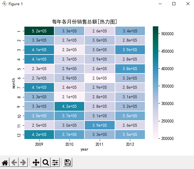 # 使用matplotlib模块绘制热力图不太方便需要借助于seaborn模块 sns.heatmap(data, cmap=None, annot=None, fmt='.2g', annot_kws=None, linewidths=0, linecolor='white') # 参数说明 1.data:需要绘图的数据 2.cmap:colormap对象,用于热力图的填充色 3.annot:bool类型或data参数形状一样的数组,True——在热力图的每个单元显示数值 4.fmt:单元格数据的显示格式 5.annot_kws:单元格中数值标签的属性,如颜色、大小等 6.linewidths:每个单元格的边框宽度 7.linecolor:每个单元格的边框颜色 '''案例''' import pandas as pd import numpy as np import seaborn as sns import matplotlib.pyplot as plt # 解决中文乱码 plt.rcParams['font.sans-serif'] = ['SimHei'] # 读取数据 Sales = pd.read_excel(r'Sales.xlsx') # 根据交易日期,提取年和月 Sales['year'] = Sales.Date.dt.year Sales['month'] = Sales.Date.dt.month # 统计每年各月份的销售总额(绘制热力图之前,必须将数据转换为交叉表) Summary = Sales.pivot_table( index = 'month', columns = 'year', values = 'Sales', aggfunc = np.sum # 求和 ) # 绘图 sns.heatmap( data = Summary, # 需要绘图的数据 cmap = 'PuBuGn', # 填充色 linewidths = 0.1, # 单元格边框宽度 annot = True, # 显示数值 fmt = '.1e' # 以科学计数法显示 ) # 标题 plt.title('每年各月份销售总额[热力图]') # 显示图形 plt.show()