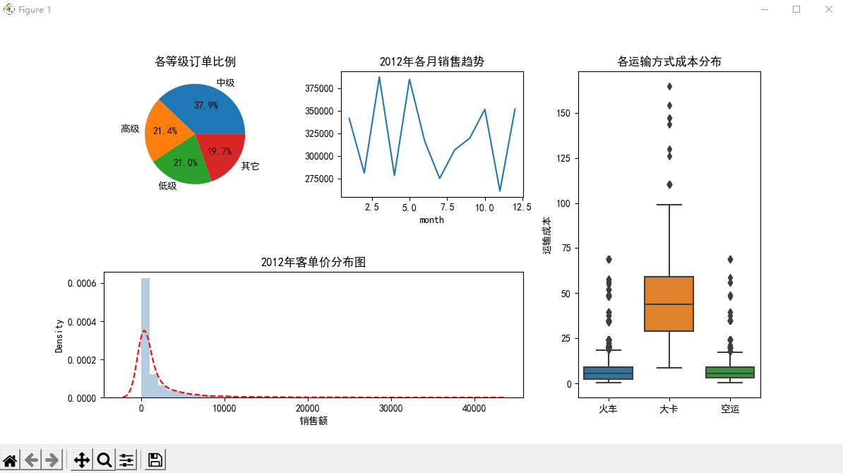 import pandas as pd import matplotlib as plt # 读取数据 Prod_Trade = pd.read_excel(r'Prod_Trade.xlsx') # 提取交易日期的年和月 Prod_Trade['year'] = Prod_Trade.Date.dt.year Prod_Trade['month'] = Prod_Trade.Date.dt.month # 设置大图框的大小 plt.figure(figsize = (12,6)) '''设置第一个子图的布局''' ax1 = plt.subplot2grid(shape = (2,3), loc = (0,0)) # 统计2012年个订单等级的数量 Class_Counts = Prod_Trade.Order_Class[Prod_Trade.year==2012].value_counts() # 绘制订单等级饼图 ax1.pie(x = Class_Percent.values, labels = Class_Percent.index,autopct = '%.1f%%') # 添加标题 ax.set_title('各等级订单比例') '''设置第二个子图的布局''' ax2 = plt.subplot2grid(shape=(2,3), loc = (0,1)) # 统计2012年每月销售额 Month_Sales = Prod_Trade[Prod_Trade.year==2012].groupby(by='month').aggregate({'Sales':np.sum}) # 绘制销售额趋势图 Month_Sales.plot(title='2012年各月销售趋势',ax=ax2,legend=False) '''设置第三个子图的布局''' ax3 = plt.subplot2grid(shape = (2,3), loc = (0,2), rowspan = 2) # 绘制各运输方式的成本箱线图 sns.boxplot(x = 'Transport', y = 'Trans_Cost', data = Prod_Trade, ax = ax3) # 添加标题 ax3.set_title('各运输方式成本分布') # 删除x轴标签 ax3.set_xlabel('') # 修改y轴标签 ax3.set_ylabel('运输成本') '''设置第四个子图的布局''' ax4 = plt.subplot2grid(shape = (2,3), loc = (1,0), colspan = 2) # 2012年客单价分布直方图 sns.distplot(Prod_Trade.Sales[Prod_Trade.year == 2012], bins = 40, norm_hist = True, ax = ax4, hist_kws = {'color':'steelblue'}, kde_kws=({'linestyle':'--', 'color':'red'})) # 添加标题 ax4.set_title('2012年客单价分布图') # 修改x轴标签 ax4.set_xlabel('销售额') # 调整子图之间的水平间距和高度间距 plt.subplots_adjust(hspace=0.6, wspace=0.3) # 图形显示 plt.show()