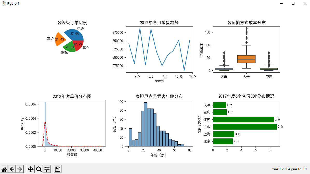 import pandas as pd import numpy as np import seaborn as sns import matplotlib.pyplot as plt # 解决中文乱码 plt.rcParams['font.sans-serif'] = ['SimHei'] # 读取数据 Prod_Trade = pd.read_excel(r'Prod_Trade.xlsx') # 提取交易日期的年和月 Prod_Trade['year'] = Prod_Trade.Date.dt.year Prod_Trade['month'] = Prod_Trade.Date.dt.month # 设置大图框的大小 plt.figure(figsize=(12, 6)) '''设置第一个子图的布局''' ax1 = plt.subplot2grid(shape=(3, 3), loc=(0, 0)) # 统计2012年个订单等级的数量 Class_Counts = Prod_Trade.Order_Class[Prod_Trade.year == 2012].value_counts() Class_Percent = Class_Counts / Class_Counts.sum() # 绘制订单等级饼图 ax1.pie(x=Class_Percent.values, labels=Class_Percent.index, autopct='%.1f%%', explode=[0,0.5,0,0] ) # 添加标题 ax1.set_title('各等级订单比例') '''设置第二个子图的布局''' ax2 = plt.subplot2grid(shape=(2, 3), loc=(0, 1)) # 统计2012年每月销售额 Month_Sales = Prod_Trade[Prod_Trade.year == 2012].groupby(by='month').aggregate({'Sales': np.sum}) # 绘制销售额趋势图 Month_Sales.plot(title='2012年各月销售趋势', ax=ax2, legend=False) '''设置第三个子图的布局''' ax3 = plt.subplot2grid(shape=(2, 3), loc=(0, 2)) # 绘制各运输方式的成本箱线图 sns.boxplot(x='Transport', y='Trans_Cost', data=Prod_Trade, ax=ax3) # 添加标题 ax3.set_title('各运输方式成本分布') # 删除x轴标签 ax3.set_xlabel('') # 修改y轴标签 ax3.set_ylabel('运输成本') '''设置第四个子图的布局''' ax4 = plt.subplot2grid(shape=(2, 3), loc=(1, 0)) # 2012年客单价分布直方图 sns.distplot(Prod_Trade.Sales[Prod_Trade.year == 2012], bins=40, norm_hist=True, ax=ax4, hist_kws={'color': 'steelblue'}, kde_kws=({'linestyle': '--', 'color': 'red'})) # 添加标题 ax4.set_title('2012年客单价分布图') # 修改x轴标签 ax4.set_xlabel('销售额') '''设置第五个子图的布局''' ax5 = plt.subplot2grid(shape=(2, 3), loc=(1, 1)) # 读取数据 Titanic = pd.read_csv('titanic_train.csv') # 校验年龄是否存在缺失值(直方图是连续的,不能使用缺失数据) any(Titanic.Age.isnull()) sns.histplot(Titanic.Age, bins=20, # 条形个数 color='steelblue', # 填充色 edgecolor='black' # 边框色 ) # x,y轴标签 plt.xlabel('年龄(岁)') plt.ylabel('频数(个)') # 标题 plt.title('泰坦尼克号乘客年龄分布') '''设置第六个子图的布局''' ax6 = plt.subplot2grid(shape=(2, 3), loc=(1, 2)) # 读入数据 GDP = pd.read_excel(r'Province GDP 2017.xlsx') # GDP.sort_values(by = 'GDP',inplace = True) # 绘制条形图 plt.barh( y=range(GDP.shape[0]), # y轴刻度 width=GDP.GDP, # x轴数值 tick_label=GDP.Province, # y轴标签 color='green' # 条形填充色 ) # x轴标签 plt.ylabel('GDP(万亿)') # 标题 plt.title('2017年度6个省份GDP分布情况') # 在每个条形末端添加数值 枚举 for y, x in enumerate(GDP.GDP): plt.text(x + 0.1, y, '%s' % round(x, 1), va='center') # 调整子图之间的水平间距和高度间距 plt.subplots_adjust(hspace=0.6, wspace=0.3) # 图形显示 plt.show()