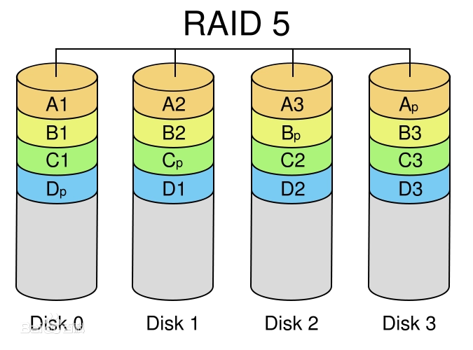 raid5:(至少需要3块硬盘)存储量--损失一块盘容量