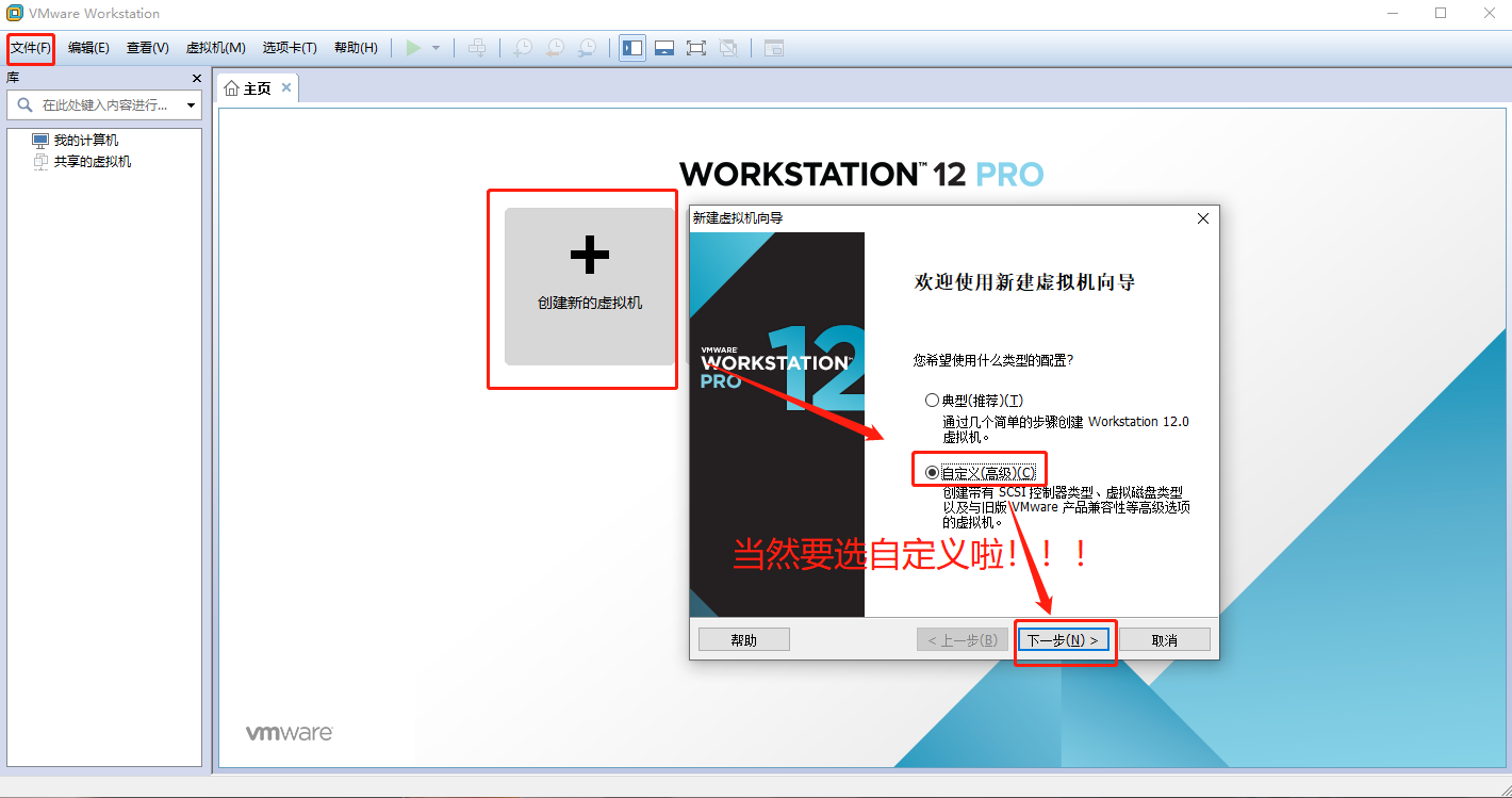 8、点击文件 -> 新建虚拟机或在主页上直接点击创建虚拟机,然后选择自定义(高级)并点击下一步