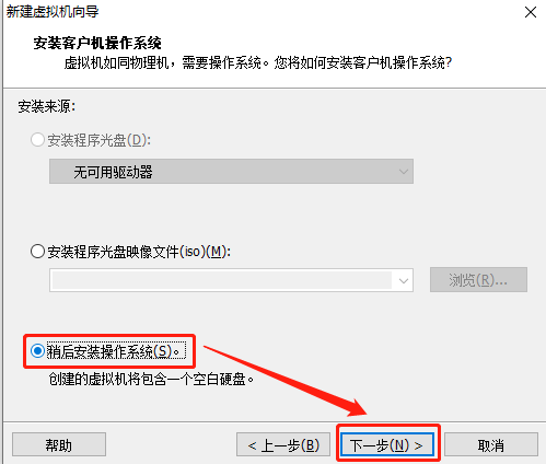 10、可以先安装虚拟机,勾选稍后安装操作系统并点击下一步