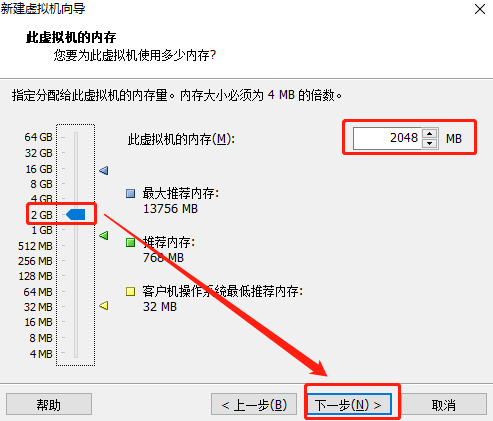 14、移动刻度条分配内存,个人学习使用2G够用了,点击下一步