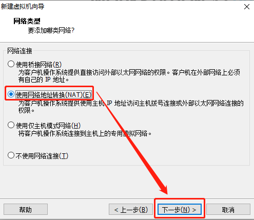 15、为了避免网络地址冲突,一般选择NAT模式,即网络地址转换,并点击下一步