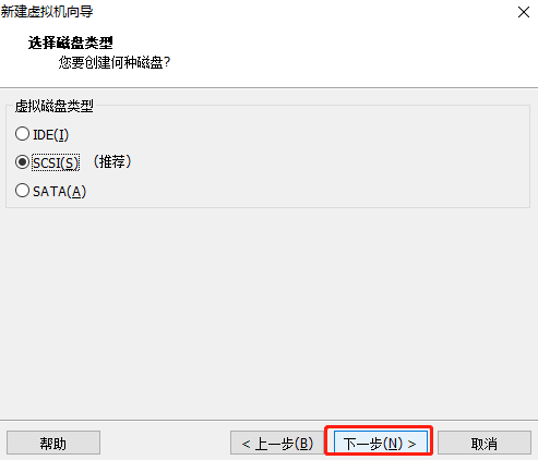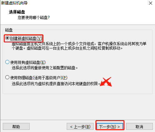 18、选择磁盘,一定不要选择使用物理磁盘,会影响物理机的使用,创建新虚拟磁盘即可,点击下一步