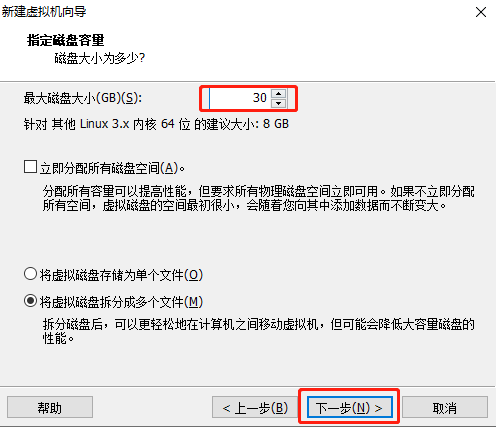 19、磁盘容量,根据需要,推荐大小以上即可,点击下一步;指定磁盘文件,默认即可,点击下一步