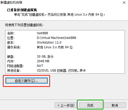 20、可点击自定义硬件修改部分设置,完毕后点击完成即可,等待创建虚拟机
