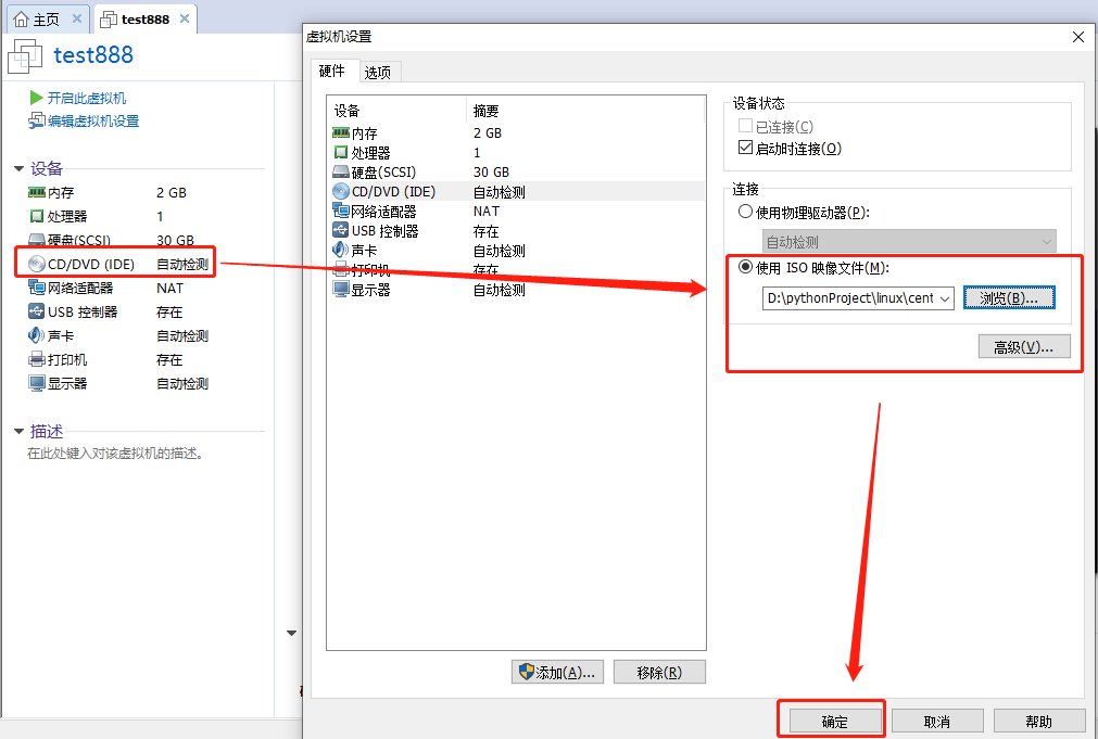 1、双击CD/DVD (IDE),选择使用ISO映像文件 -> 浏览 选择需要安装的操作系统的.iso文件,点击确定