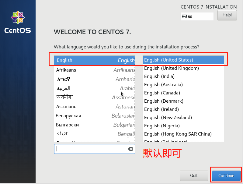5、选择语言,默认英语即可(可选中文),点击Continue