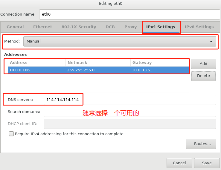 9、切换至IPv4选项卡,方法下拉框改成手动,配置IP地址与DNS服务器,点击Save保存,点击Done
