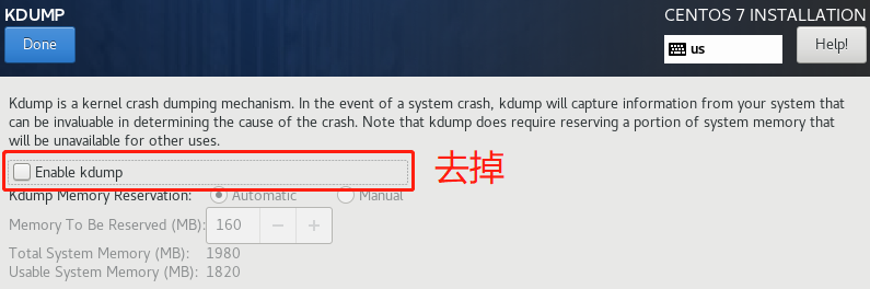 10、点击KDUMP,将Enable kdump前默认的勾去掉,点击Done