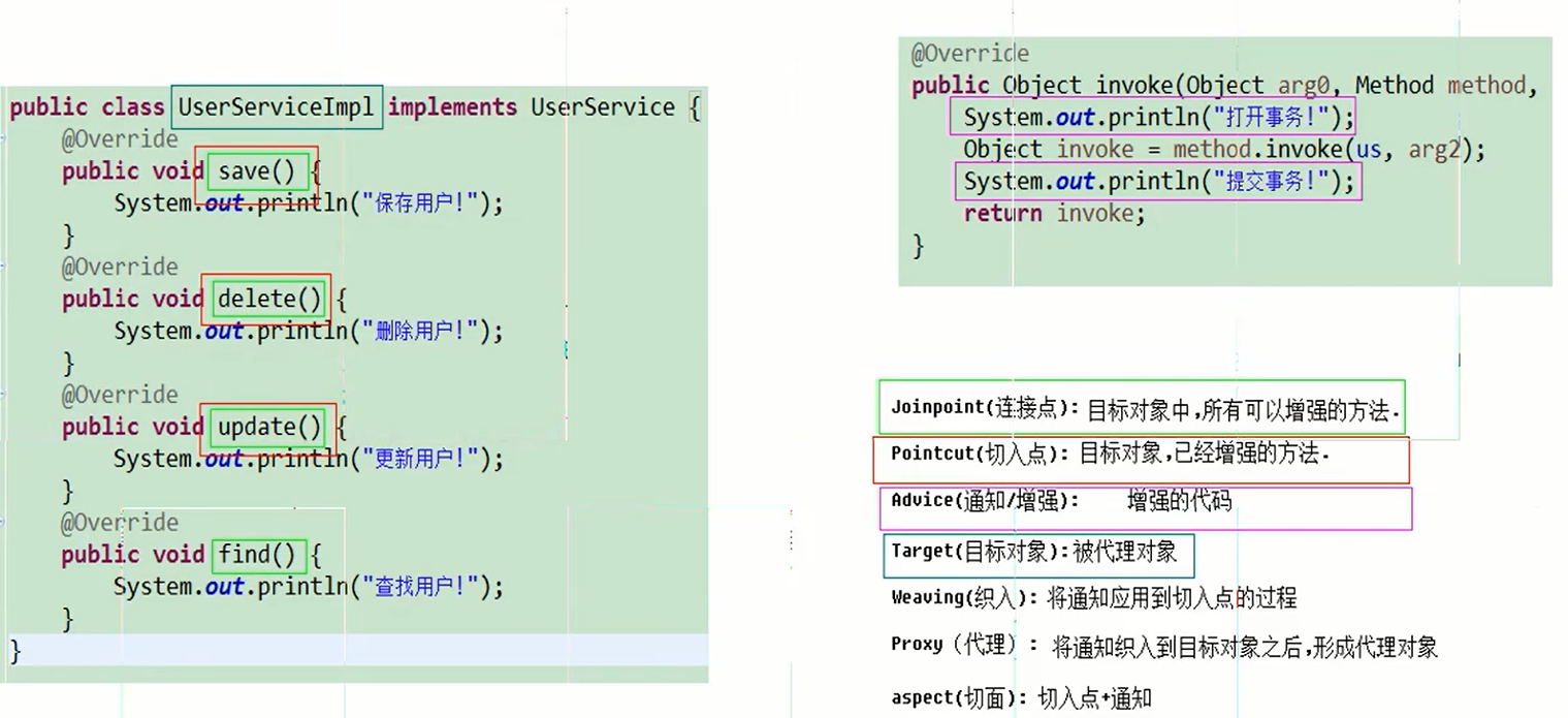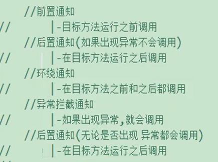 <?xml version="1.0" encoding="UTF-8"?> <beans xmlns:xsi="http://www.w3.org/2001/XMLSchema-instance" xmlns="http://www.springframework.org/schema/beans" xmlns:context="http://www.springframework.org/schema/context" xmlns:aop="http://www.springframework.org/schema/aop" xsi:schemaLocation="http://www.springframework.org/schema/beans http://www.springframework.org/schema/beans/spring-beans-4.2.xsd http://www.springframework.org/schema/context http://www.springframework.org/schema/context/spring-context-4.2.xsd http://www.springframework.org/schema/aop http://www.springframework.org/schema/aop/spring-aop-4.2.xsd "> <!-- 准备工作:导入aop(约束)命名空间 --> <!-- 1.配置目标对象 --> <bean name="UserServiceTarget" class="cn.itcast.service.UserServiceImpl"></bean> <!-- 配置通知对象 --> <bean name="myAdvice" class="cn.itcast.d_springaop.MyAdvice"> </bean> <!-- 将通知对象织入目标对象 --> <aop:config> <!-- 配置切入点 * cn.itcast.service.*ServiceImpl.*(..) --> <aop:pointcut expression="execution(* cn.itcast.service.*ServiceImpl.*(..))" id="pc"/> <aop:aspect ref="myAdvice"> <aop:before method="before" pointcut-ref="pc"/> <aop:after-returning method="afterReturning" pointcut-ref="pc"/> <aop:around method="around" pointcut-ref="pc"/> <aop:after-throwing method="afterException" pointcut-ref="pc"/> <aop:after method="after" pointcut-ref="pc"/> </aop:aspect> </aop:config> </beans>