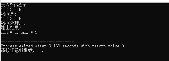 1 #include <stdio.h> 2 #define N 5 3 4 void input(int x[], int n); 5 void output(int x[], int n); 6 void find_min_max(int x[], int n, int *pmin, int *pmax); 7 8 int main() { 9 int a[N]; 10 int min, max; 11 12 printf("录入%d个数据:\n", N); 13 input(a, N); 14 15 printf("数据是: \n"); 16 output(a, N); 17 18 printf("数据处理...\n"); 19 find_min_max(a, N, &min, &max); 20 21 printf("输出结果:\n"); 22 printf("min = %d, max = %d\n", min, max); 23 24 return 0; 25 } 26 27 void input(int x[], int n) { 28 int i; 29 30 for(i = 0; i < n; ++i) 31 scanf("%d", &x[i]); 32 } 33 34 void output(int x[], int n) { 35 int i; 36 37 for(i = 0; i < n; ++i) 38 printf("%d ", x[i]); 39 printf("\n"); 40 } 41 42 void find_min_max(int x[], int n, int *pmin, int *pmax) { 43 int i; 44 45 *pmin = *pmax = x[0]; 46 47 for(i = 1; i < n; ++i) 48 if(x[i] < *pmin) 49 *pmin = x[i]; 50 else if(x[i] > *pmax) 51 *pmax = x[i]; 52 }