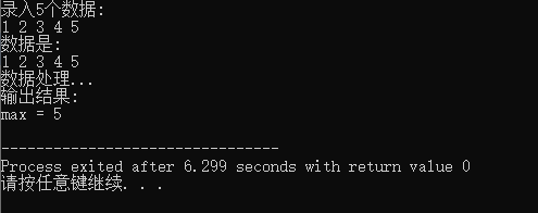 1 #include <stdio.h> 2 #define N 5 3 4 void input(int x[], int n); 5 void output(int x[], int n); 6 int *find_max(int x[], int n); 7 8 int main() { 9 int a[N]; 10 int *pmax; 11 12 printf("录入%d个数据:\n", N); 13 input(a, N); 14 15 printf("数据是: \n"); 16 output(a, N); 17 18 printf("数据处理...\n"); 19 pmax = find_max(a, N); 20 21 printf("输出结果:\n"); 22 printf("max = %d\n", *pmax); 23 24 return 0; 25 } 26 27 void input(int x[], int n) { 28 int i; 29 30 for(i = 0; i < n; ++i) 31 scanf("%d", &x[i]); 32 } 33 34 void output(int x[], int n) { 35 int i; 36 37 for(i = 0; i < n; ++i) 38 printf("%d ", x[i]); 39 printf("\n"); 40 } 41 42 int *find_max(int x[], int n) { 43 int max_index = 0; 44 int i; 45 46 for(i = 1; i < n; ++i) 47 if(x[i] > x[max_index]) 48 max_index = i; 49 50 return &x[max_index]; 51 }
