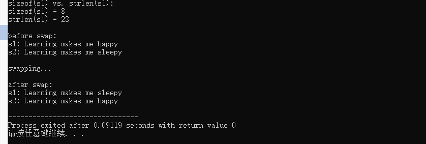 1 #include <stdio.h> 2 #include <string.h> 3 #define N 80 4 5 int main() { 6 char s1[] = "Learning makes me happy"; 7 char s2[] = "Learning makes me sleepy"; 8 char tmp[N]; 9 10 printf("sizeof(s1) vs. strlen(s1): \n"); 11 printf("sizeof(s1) = %d\n", sizeof(s1)); 12 printf("strlen(s1) = %d\n", strlen(s1)); 13 14 printf("\nbefore swap: \n"); 15 printf("s1: %s\n", s1); 16 printf("s2: %s\n", s2); 17 18 printf("\nswapping...\n"); 19 strcpy(tmp, s1); 20 strcpy(s1, s2); 21 strcpy(s2, tmp); 22 23 printf("\nafter swap: \n"); 24 printf("s1: %s\n", s1); 25 printf("s2: %s\n", s2); 26 27 return 0; 28 }