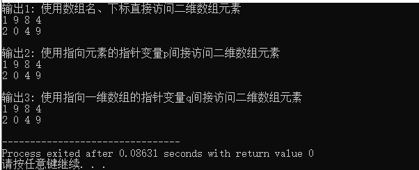 1 #include <stdio.h> 2 3 #include <stdio.h> 4 5 int main() { 6 int x[2][4] = {{1, 9, 8, 4}, {2, 0, 4, 9}}; 7 int i, j; 8 int *ptr1; // 指针变量,存放int类型数据的地址 9 int(*ptr2)[4]; // 指针变量,指向包含4个int元素的一维数组 10 11 printf("输出1: 使用数组名、下标直接访问二维数组元素\n"); 12 for (i = 0; i < 2; ++i) { 13 for (j = 0; j < 4; ++j) 14 printf("%d ", x[i][j]); 15 printf("\n"); 16 } 17 18 printf("\n输出2: 使用指向元素的指针变量p间接访问二维数组元素\n"); 19 for (ptr1 = &x[0][0], i = 0; ptr1 < &x[0][0] + 8; ++ptr1, ++i) { 20 printf("%d ", *ptr1); 21 22 if ((i + 1) % 4 == 0) 23 printf("\n"); 24 } 25 26 printf("\n输出3: 使用指向一维数组的指针变量q间接访问二维数组元素\n"); 27 for (ptr2 = x; ptr2 < x + 2; ++ptr2) { 28 for (j = 0; j < 4; ++j) 29 printf("%d ", *(*ptr2 + j)); 30 printf("\n"); 31 } 32 33 return 0; 34 }