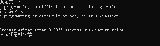1 #include <stdio.h> 2 #define N 80 3 4 void replace(char *str, char old_char, char new_char); // 函数声明 5 6 int main() { 7 char text[N] = "c programming is difficult or not, it is a question."; 8 9 printf("原始文本: \n"); 10 printf("%s\n", text); 11 12 replace(text, 'i', '*'); // 函数调用 注意字符形参写法,单引号不能少 13 14 printf("处理后文本: \n"); 15 printf("%s\n", text); 16 17 return 0; 18 } 19 20 // 函数定义 21 void replace(char *str, char old_char, char new_char) { 22 int i; 23 24 while(*str) { 25 if(*str == old_char) 26 *str = new_char; 27 str++; 28 } 29 }