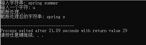 1 #include <stdio.h> 2 #define N 80 3 4 void str_trunc(char *str, char x); 5 6 int main() { 7 char str[N]; 8 char ch; 9 10 printf("输入字符串: "); 11 gets(str); 12 13 printf("输入一个字符: "); 14 ch = getchar(); 15 16 printf("截断处理...\n"); 17 str_trunc(str, ch); 18 19 printf("截断处理后的字符串: %s\n", str); 20 21 } 22 23 void str_trunc(char *str, char x) { 24 while(*str) { 25 if(*str == x) 26 break; 27 str++; 28 } 29 *str=0; 30 31 }