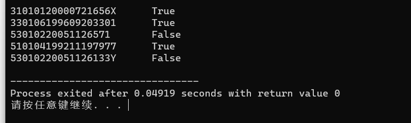 1 #include <stdio.h> 2 #include <string.h> 3 #define N 5 4 5 int check_id(char *str); // 函数声明 6 7 int main() { 8 char *pid[N] = {"31010120000721656X", 9 "330106199609203301", 10 "53010220051126571", 11 "510104199211197977", 12 "53010220051126133Y"}; 13 int i; 14 15 for (i = 0; i < N; ++i) 16 if (check_id(pid[i])) // 函数调用 17 printf("%s\tTrue\n", pid[i]); 18 else 19 printf("%s\tFalse\n", pid[i]); 20 21 return 0; 22 } 23 24 // 函数定义 25 // 功能: 检查指针str指向的身份证号码串形式上是否合法。 26 // 形式合法,返回1,否则,返回0 27 int check_id(char *str) { 28 int i; 29 if(strlen(str)!=18) 30 return 0; 31 for(i=0;i<18;i++) 32 if(*(str+i)<'0'||*(str+i)>'9') 33 { 34 if(*(str+i)!='X') 35 return 0; 36 } 37 return 1; 38 39 }
