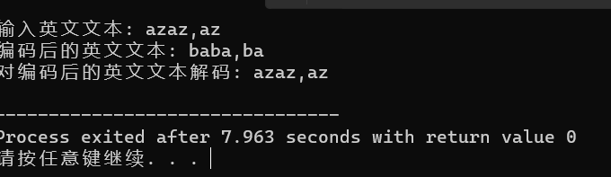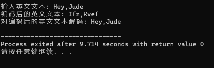 1 #include <stdio.h> 2 #define N 80 3 void encoder(char *str); // 函数声明 4 void decoder(char *str); // 函数声明 5 6 int main() { 7 char words[N]; 8 9 printf("输入英文文本: "); 10 gets(words); 11 12 printf("编码后的英文文本: "); 13 encoder(words); // 函数调用 14 printf("%s\n", words); 15 16 printf("对编码后的英文文本解码: "); 17 decoder(words); // 函数调用 18 printf("%s\n", words); 19 20 return 0; 21 } 22 23 /*函数定义 24 功能:对s指向的字符串进行编码处理 25 编码规则: 26 对于a~z或A~Z之间的字母字符,用其后的字符替换; 其中,z用a替换,Z用A替换 27 其它非字母字符,保持不变 28 */ 29 void encoder(char *str) { 30 int i; 31 for(i=0;i<N&&*(str+i)!=0;i++) 32 { 33 if(*(str+i)>='a'&&*(str+i)<='z'||*(str+i)>='A'&&*(str+i)<='Z') 34 { 35 if(*(str+i)=='z') 36 {*(str+i)='a'; continue;} 37 if(*(str+i)=='Z') 38 {*(str+i)='A'; continue;} 39 *(str+i)+=1; 40 } 41 } 42 } 43 44 /*函数定义 45 功能:对s指向的字符串进行解码处理 46 解码规则: 47 对于a~z或A~Z之间的字母字符,用其前面的字符替换; 其中,a用z替换,A用Z替换 48 其它非字母字符,保持不变 49 */ 50 void decoder(char *str) { 51 int i; 52 for(i=0;i<N&&*(str+i)!=0;i++) 53 { 54 if(*(str+i)>='a'&&*(str+i)<='z'||*(str+i)>='A'&&*(str+i)<='Z') 55 { 56 if(*(str+i)=='a') 57 {*(str+i)='z'; continue;} 58 if(*(str+i)=='A') 59 {*(str+i)='Z'; continue;} 60 *(str+i)-=1; 61 } 62 } 63 }