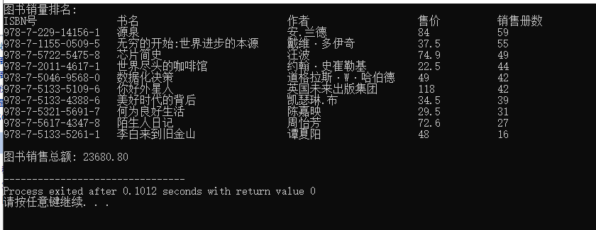 1 #include <stdio.h> 2 #define N 10 3 4 typedef struct { 5 char isbn[20]; // isbn号 6 char name[80]; // 书名 7 char author[80]; // 作者 8 double sales_price; // 售价 9 int sales_count; // 销售册数 10 } Book; 11 12 void output(Book x[], int n); 13 void sort(Book x[], int n); 14 double sales_amount(Book x[], int n); 15 16 int main() { 17 Book x[N] = {{"978-7-229-14156-1", "源泉", "安.兰德", 84, 59}, 18 {"978-7-5133-5261-1", "李白来到旧金山", "谭夏阳", 48, 16}, 19 {"978-7-5617-4347-8", "陌生人日记", "周怡芳", 72.6, 27}, 20 {"978-7-5722-5475-8", "芯片简史", "汪波", 74.9, 49}, 21 {"978-7-5046-9568-0", "数据化决策", "道格拉斯·W·哈伯德", 49, 42}, 22 {"978-7-5133-4388-6", "美好时代的背后", "凯瑟琳.布", 34.5, 39}, 23 {"978-7-1155-0509-5", "无穷的开始:世界进步的本源", "戴维·多伊奇", 37.5, 55}, 24 {"978-7-5321-5691-7", "何为良好生活", "陈嘉映", 29.5 , 31}, 25 {"978-7-5133-5109-6", "你好外星人", "英国未来出版集团", 118, 42}, 26 {"978-7-2011-4617-1", "世界尽头的咖啡馆", "约翰·史崔勒基", 22.5, 44}}; 27 28 printf("图书销量排名: \n"); 29 sort(x, N); 30 output(x, N); 31 32 printf("\n图书销售总额: %.2f\n", sales_amount(x, N)); 33 34 return 0; 35 } 36 37 // 待补足:函数output()实现 38 // ××× 39 void output(Book x[], int n) 40 { 41 int i; 42 printf("ISBN号 书名 作者 售价 销售册数\n"); 43 for(i=0;i<n;i++) 44 { 45 printf("%-20s%-30s%-20s %-10g %d\n",x[i].isbn,x[i].name,x[i].author,x[i].sales_price,x[i].sales_count); 46 } 47 } 48 49 50 // 待补足:函数sort()实现 51 // ××× 52 void sort(Book x[], int n) 53 { 54 int i,j; 55 Book a; 56 for(i=0;i<n-1;i++) 57 for(j=0;j<n-1-i;j++) 58 { 59 if(x[j].sales_count<x[j+1].sales_count) 60 { 61 a=x[j]; 62 x[j]=x[j+1]; 63 x[j+1]=a; 64 } 65 } 66 } 67 68 // 待补足:函数sales_count()实现 69 // ××× 70 double sales_amount(Book x[], int n) 71 { 72 double s=0; 73 int i; 74 for(i=0;i<n;i++) 75 s+=x[i].sales_price*x[i].sales_count; 76 return s; 77 }