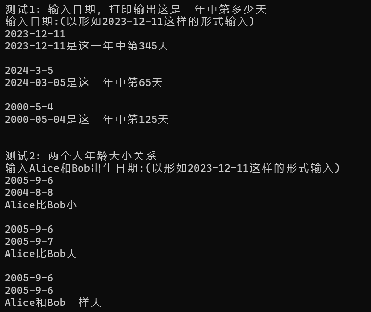 1 #include <stdio.h> 2 3 typedef struct { 4 int year; 5 int month; 6 int day; 7 } Date; 8 9 // 函数声明 10 void input(Date *pd); // 输入日期给pd指向的Date变量 11 int day_of_year(Date d); // 返回日期d是这一年的第多少天 12 int compare_dates(Date d1, Date d2); // 比较两个日期: 13 // 如果d1在d2之前,返回-1; 14 // 如果d1在d2之后,返回1 15 // 如果d1和d2相同,返回0 16 17 void test1() { 18 Date d; 19 int i; 20 21 printf("输入日期:(以形如2023-12-11这样的形式输入)\n"); 22 for(i = 0; i < 3; ++i) { 23 input(&d); 24 printf("%d-%02d-%02d是这一年中第%d天\n\n", d.year, d.month, d.day, day_of_year(d)); 25 } 26 } 27 28 void test2() { 29 Date Alice_birth, Bob_birth; 30 int i; 31 int ans; 32 33 printf("输入Alice和Bob出生日期:(以形如2023-12-11这样的形式输入)\n"); 34 for(i = 0; i < 3; ++i) { 35 input(&Alice_birth); 36 input(&Bob_birth); 37 ans = compare_dates(Alice_birth, Bob_birth); 38 39 if(ans == 0) 40 printf("Alice和Bob一样大\n\n"); 41 else if(ans == -1) 42 printf("Alice比Bob大\n\n"); 43 else 44 printf("Alice比Bob小\n\n"); 45 } 46 } 47 48 int main() { 49 printf("测试1: 输入日期, 打印输出这是一年中第多少天\n"); 50 test1(); 51 52 printf("\n测试2: 两个人年龄大小关系\n"); 53 test2(); 54 } 55 56 // 补足函数input实现 57 // 功能: 输入日期给pd指向的Date变量 58 void input(Date *pd) 59 { 60 scanf("%d-%d-%d",&pd->year,&pd->month,&pd->day); 61 } 62 63 // 补足函数day_of_year实现 64 // 功能:返回日期d是这一年的第多少天 65 int day_of_year(Date d) { 66 int s; 67 d.month-=1; 68 if(d.month==0) 69 s=d.day; 70 else if(d.month<=7) 71 s=((d.month-1)/2+1)*31+d.month/2*30+d.day-2; 72 else 73 s=(d.month/2+1)*31+((d.month+1)/2-1)*30+d.day-2; 74 if((d.year%4==0&&d.year%100!=0)||d.year%400==0) 75 s=s+1; 76 return s; 77 78 } 79 80 // 补足函数compare_dates实现 81 // 功能:比较两个日期: 82 // 如果d1在d2之前,返回-1; 83 // 如果d1在d2之后,返回1 84 // 如果d1和d2相同,返回0 85 int compare_dates(Date d1, Date d2) { 86 if(d1.year<d2.year) 87 return -1; 88 else if(d1.year>d2.year) 89 return 1; 90 else 91 { 92 if(day_of_year(d1)>day_of_year(d2)) 93 return 1; 94 else if(day_of_year(d1)<day_of_year(d2)) 95 return -1; 96 else 97 return 0; 98 } 99 }