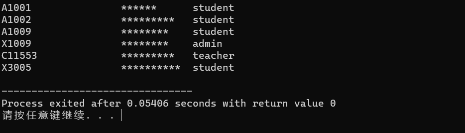 1 #include <stdio.h> 2 #include <string.h> 3 4 enum Role {admin, student, teacher}; 5 6 typedef struct { 7 char username[20]; // 用户名 8 char password[20]; // 密码 9 enum Role type; // 账户类型 10 } Account; 11 12 13 // 函数声明 14 void output(Account x[], int n); // 输出账户数组x中n个账户信息,其中,密码用*替代显示 15 16 int main() { 17 Account x[] = {{"A1001", "123456", student}, 18 {"A1002", "123abcdef", student}, 19 {"A1009", "xyz12121", student}, 20 {"X1009", "9213071x", admin}, 21 {"C11553", "129dfg32k", teacher}, 22 {"X3005", "921kfmg917", student}}; 23 int n; 24 n = sizeof(x)/sizeof(Account); 25 output(x, n); 26 27 return 0; 28 } 29 30 // 待补足的函数output()实现 31 // 功能:遍历输出账户数组x中n个账户信息 32 // 显示时,密码字段以与原密码相同字段长度的*替代显示 33 void output(Account x[], int n) { 34 int i,len,j; 35 for(i=0;i<n;i++) 36 { 37 printf("%-20s",x[i].username); 38 len=strlen(x[i].password); 39 for(j=1;j<=len;j++) 40 printf("*"); 41 42 if(x[i].type==0) 43 printf("\tadmin\n"); 44 else if(x[i].type==1) 45 printf("\tstudent\n"); 46 else 47 printf("\tteacher\n"); 48 } 49 }