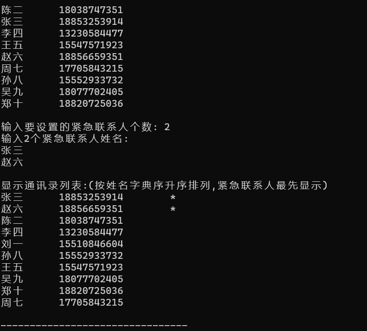1 #include <stdio.h> 2 #include <string.h> 3 4 typedef struct { 5 char name[20]; // 姓名 6 char phone[12]; // 手机号 7 int vip; // 是否为紧急联系人,是取1;否则取0 8 } Contact; 9 10 11 // 函数声明 12 void set_vip_contact(Contact x[], int n, char name[]); // 设置紧急联系人 13 void output(Contact x[], int n); // 输出x中联系人信息 14 void display(Contact x[], int n); // 按联系人姓名字典序升序显示信息,紧急联系人最先显示 15 16 17 #define N 10 18 int main() { 19 Contact list[N] = {{"刘一", "15510846604", 0}, 20 {"陈二", "18038747351", 0}, 21 {"张三", "18853253914", 0}, 22 {"李四", "13230584477", 0}, 23 {"王五", "15547571923", 0}, 24 {"赵六", "18856659351", 0}, 25 {"周七", "17705843215", 0}, 26 {"孙八", "15552933732", 0}, 27 {"吴九", "18077702405", 0}, 28 {"郑十", "18820725036", 0}}; 29 int vip_cnt, i; 30 char name[20]; 31 32 printf("显示原始通讯录信息: \n"); 33 output(list, N); 34 35 printf("\n输入要设置的紧急联系人个数: "); 36 scanf("%d", &vip_cnt); 37 printf("输入%d个紧急联系人姓名:\n", vip_cnt); 38 for(i = 0; i < vip_cnt; ++i) { 39 scanf("%s", name); 40 set_vip_contact(list, N, name); 41 } 42 43 printf("\n显示通讯录列表:(按姓名字典序升序排列,紧急联系人最先显示)\n"); 44 display(list, N); 45 46 return 0; 47 } 48 49 // 补足函数set_vip_contact实现 50 // 功能:将联系人数组x中,联系人姓名与name一样的人,设置为紧急联系人(即成员vip值设为1) 51 void set_vip_contact(Contact x[], int n, char name[]) { 52 int i; 53 for(i=0;i<10;i++) 54 if(strcmp(name,x[i].name)==0) 55 x[i].vip=1; 56 } 57 58 // 补足函数display实现 59 // 功能: 显示联系人数组x中的联系人信息 60 // 按姓名字典序升序显示, 紧急联系人显示在最前面 61 void display(Contact x[], int n) { 62 int i,j,count=0; 63 Contact q; 64 for(i=0;i<10;i++) 65 if(x[i].vip==1) 66 { 67 for(j=i;j>0;j--) 68 { 69 q=x[j]; 70 x[j]=x[j-1]; 71 x[j-1]=q; 72 } 73 count++; 74 } 75 76 77 for(i=0;i<count-1;i++) 78 for(j=0;j<count-1-i;j++) 79 { 80 if(strcmp(x[j].name,x[j+1].name)>0) 81 { 82 q=x[j]; 83 x[j]=x[j+1]; 84 x[j+1]=q; 85 } 86 } 87 for(i=count;i<9;i++) 88 for(j=count;j<9;j++) 89 { 90 if(strcmp(x[j].name,x[j+1].name)>0) 91 { 92 q=x[j]; 93 x[j]=x[j+1]; 94 x[j+1]=q; 95 } 96 } 97 98 output(x,N);} 99 100 void output(Contact x[], int n) { 101 int i; 102 103 for(i = 0; i < n; ++i) { 104 printf("%-10s%-15s", x[i].name, x[i].phone); 105 if(x[i].vip) 106 printf("%5s", "*"); 107 printf("\n"); 108 } 109 }