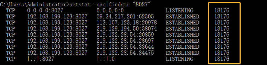 回车执行该命令,最后一列就是PID, 这里是 18176