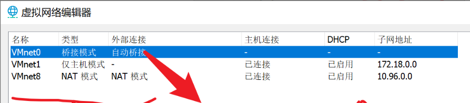 下图是vmware的虚拟网络编辑器的截图。其中Vmnet0负责桥接模式通信,Vmnet8负责nat模式通信。