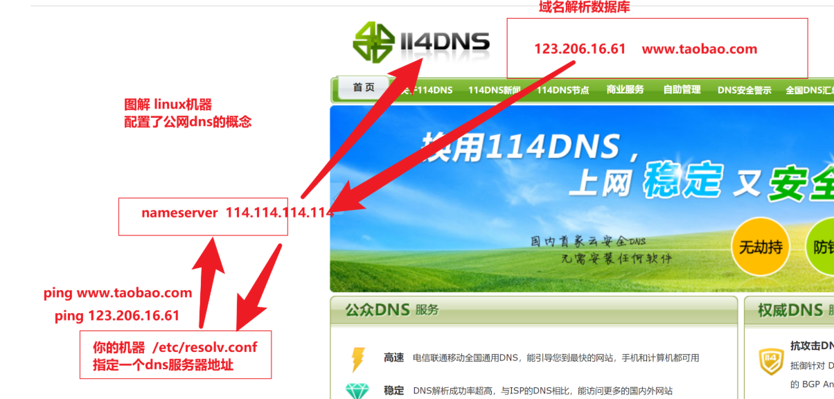 例如,linux主机 ping www.taobao.com,linux主机读取/etc/resolv.conf指定的dns服务器地址,例如114.114.114.114。然后linux主机问114.114.114.114 ,www.taobao.com的ip地址是多少。114DNS查找自身的域名解析数据库,找到www.taobao.com对应的ip地址,返回给Linux主机。